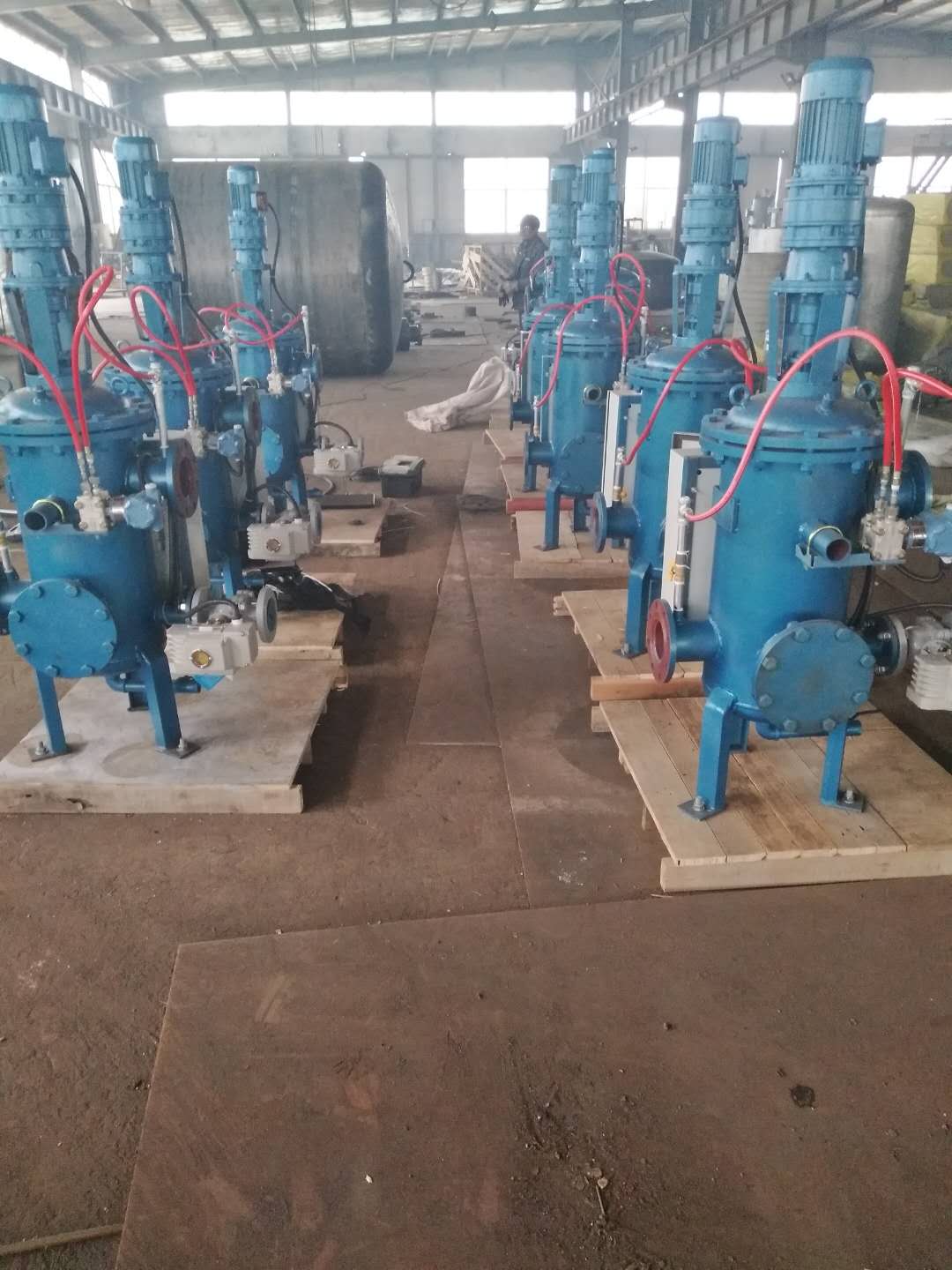 手動(dòng)工作過程:濾水器接入管道系統(tǒng)后,水由下部進(jìn)水口進(jìn)入濾水器,過濾雜物后的水從出水口流出,當(dāng)水中雜質(zhì)通過網(wǎng)芯時(shí),由于體積大于網(wǎng)芯孔,而衩截留在網(wǎng)芯上,當(dāng)聚積到一定數(shù)量時(shí),即造成進(jìn)水口和出水口有一定壓差值。當(dāng)濾網(wǎng)的進(jìn)口壓力表和出口壓力表水壓差增大到規(guī)定數(shù)值時(shí)(濾網(wǎng)精度直徑不同壓差不同,一般為0.15Mpa),打開排污閥投入工作,水流對(duì)附著在網(wǎng)芯內(nèi)側(cè)壁面上的雜質(zhì)污物反向沖洗,將附著物排出濾網(wǎng),待內(nèi)外壓差恢復(fù)到正常時(shí)關(guān)閉排污閥,從而完成過濾排污工作過程。